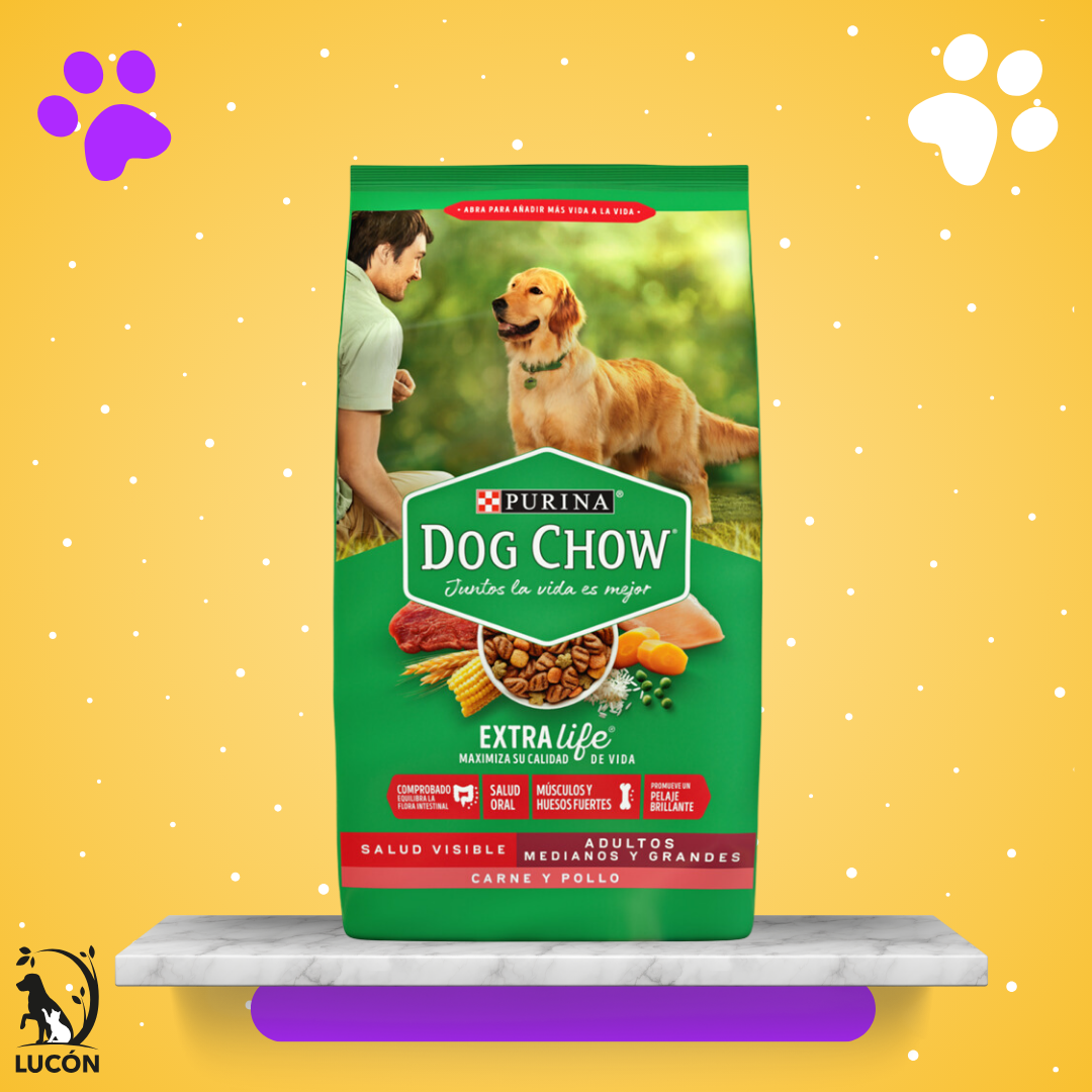 Alimento seco para perros adultos medianos y grandes DOG CHOW® con Carne y Pollo, sin colorantes. En cada croqueta encontrarás un alimento 100% balanceado, con probióticos naturales que equilibran su flora intestinal, omegas 6 y 3 y niveles de sodio adecuados. Ayuda a cuidar la salud oral, a mantener un corazón sano y tener músculos y huesos fuertes. Con Extralife, una mezcla especial de antioxidantes, vitaminas y minerales que ayuda a maximizar la calidad de vida de tu perro día tras día, entregando hasta 1,8 años más de vida saludable juntos.