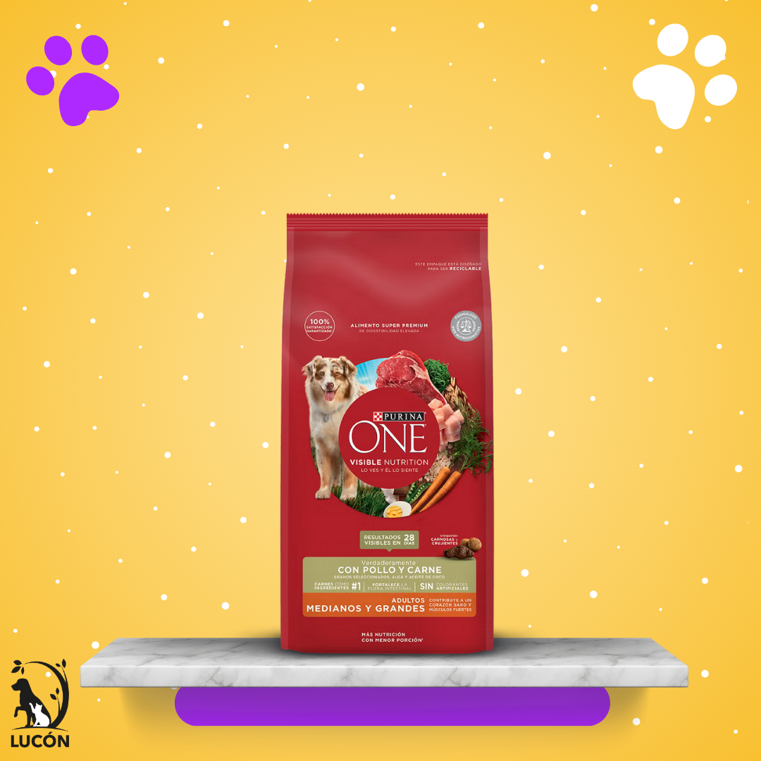 Alimento seco para perros adultos medianos y grandes PURINA® ONE® con Pollo y Carne. Con carnes como ingredientes #1, granos seleccionados, alga como fuente de Omega 3 y aceite de coco como fuente alternativa de energía. Con probióticos naturales que fortalecen la flora intestinal y garantizan una mejor digestión y heces más firmes.